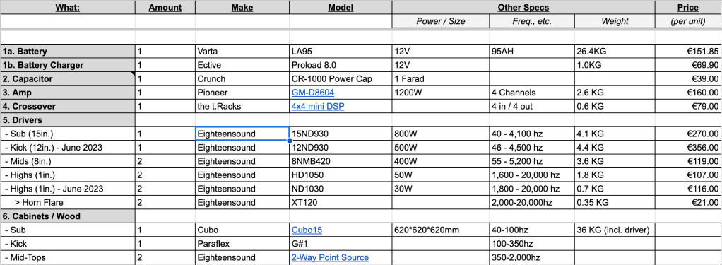 Here is a list of components used, as well as the functions, weight and price. It’s a work in progress, and I still need to add the small bits, and the overall weights for each speaker.